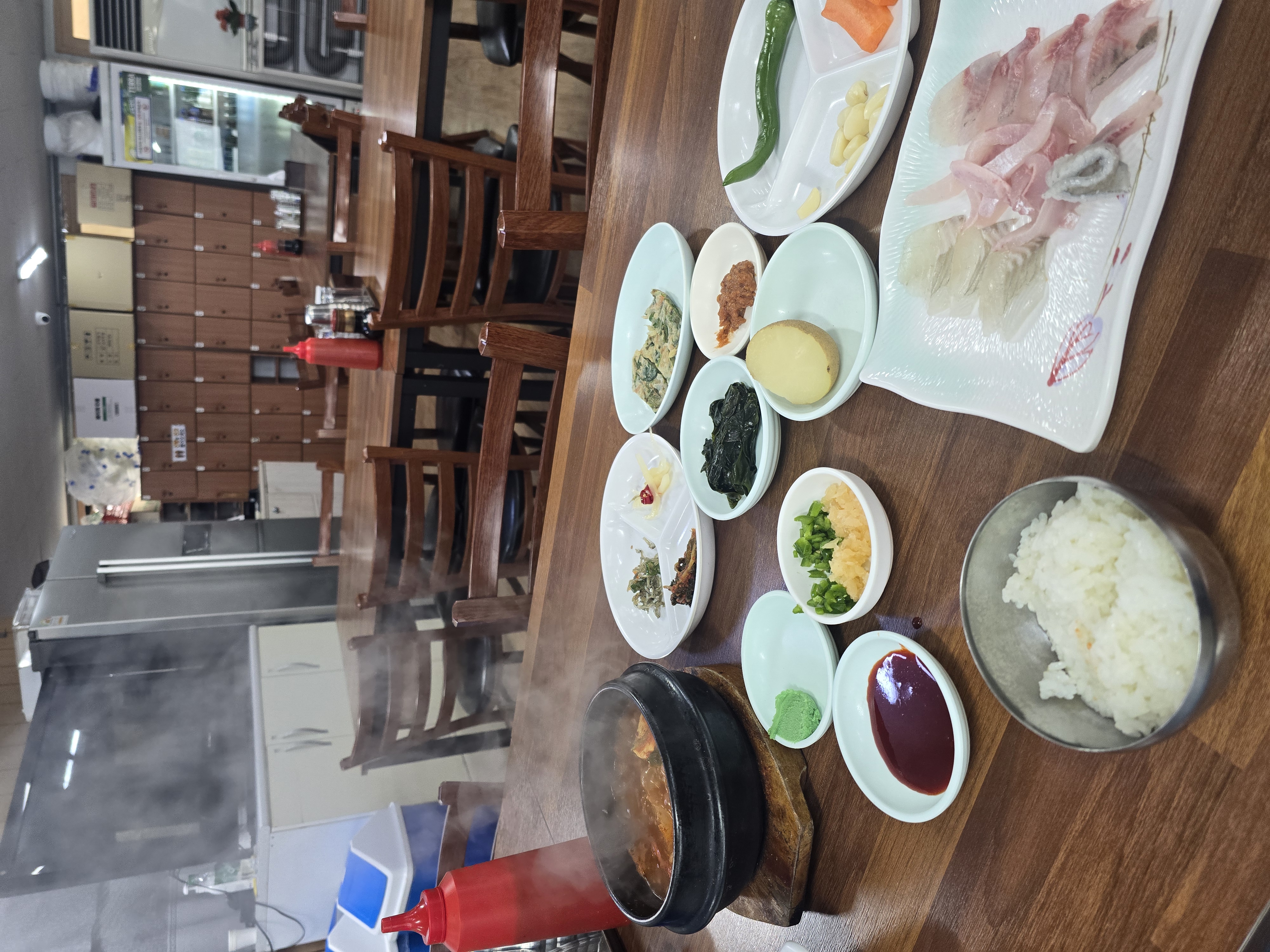 구성: 회 + 밑반찬 약 10종 + 매운탕 + 밥