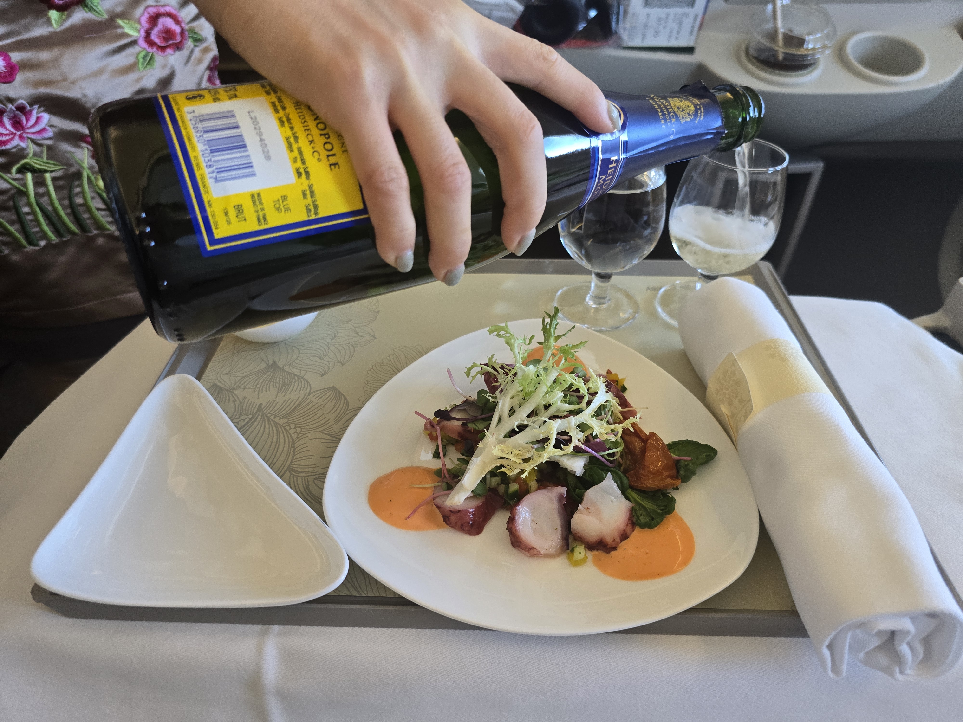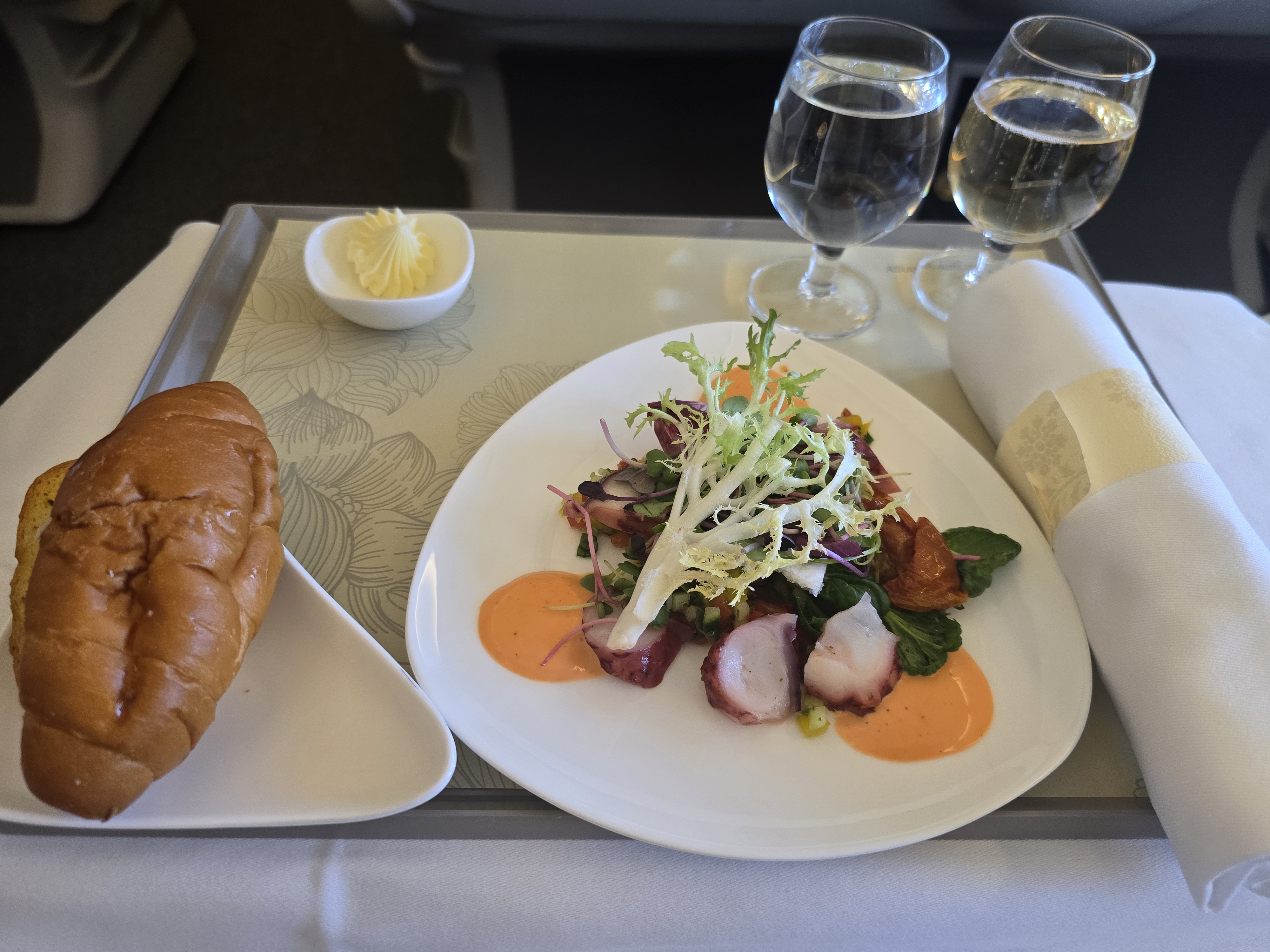 비즈니스석임에도 빈자리가 거의 없이 탑승률은 꽤 높은 편이었지만, 캐빈 분위기는 조용하고 차분했습니다. 승무원들의 응대는 친절하고 안정적이었으며, 이른 시간대의 출발임에도 불구하고 전반적인 서비스 품질은 준수했다. 전체 여정이 4시간 정도의 짧다면 짧고 길다면 긴 구간이었지만 편안하게 이동할 수 있었습니다.