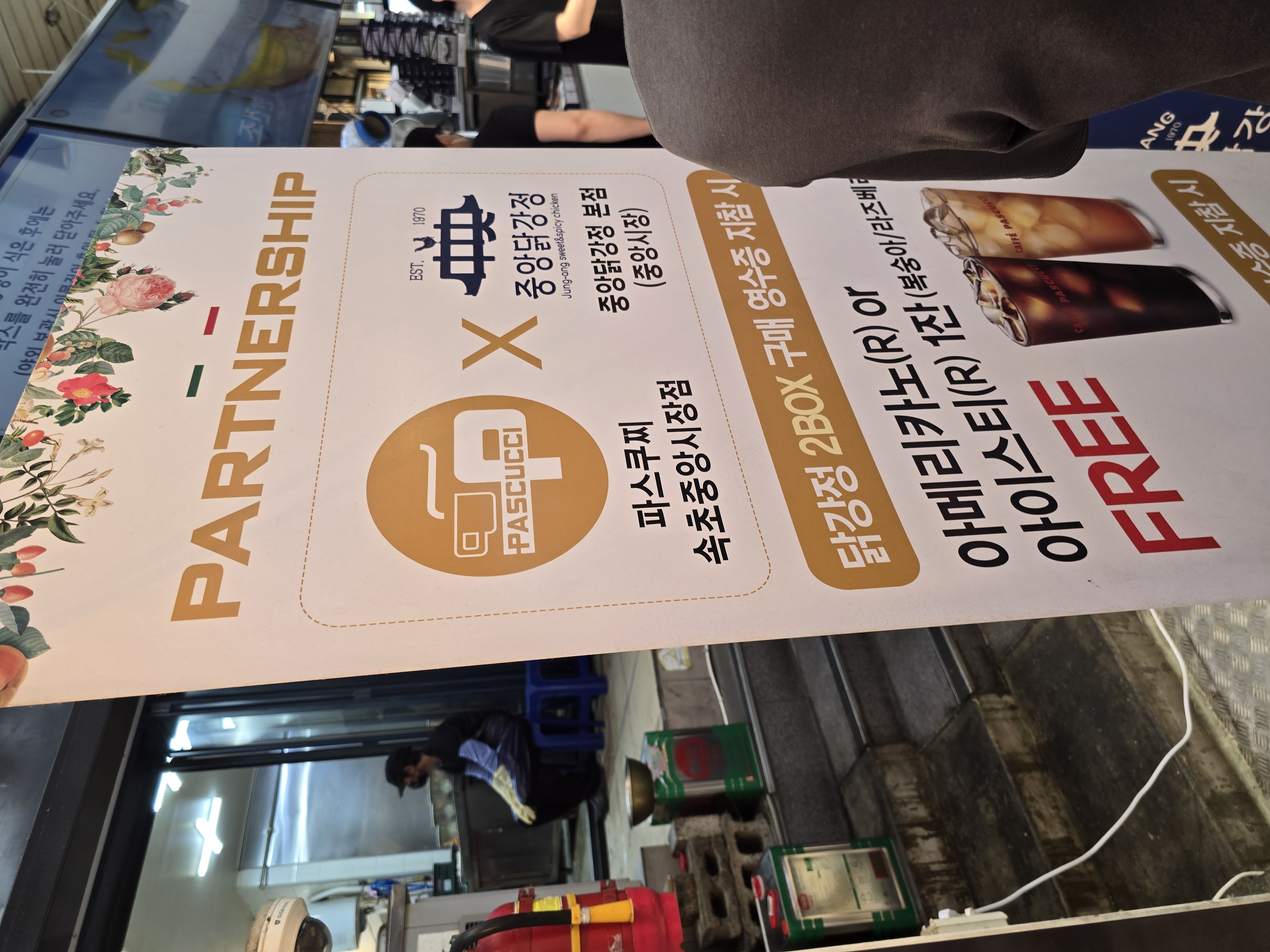 이미 맛집 블로거로서의 본능은 중앙닭강정을 선택하게 만들었고, 자연스럽게 발걸음을 그쪽으로 향했습니다. 잠시 기다리는 동안 매장 곳곳에 붙은 안내판에서 알게 된 재미있는 사실이 있습니다. 중앙닭강정의 사장님이 근처에 위치한 파스쿠치 카페의 주인으로 추정!!! 흥미로운 점은 중앙닭강정에서 닭강정 두 마리 이상 구매 시 근처 파스쿠치에서 커피를 무료로 제공한다는 것이었습니다.