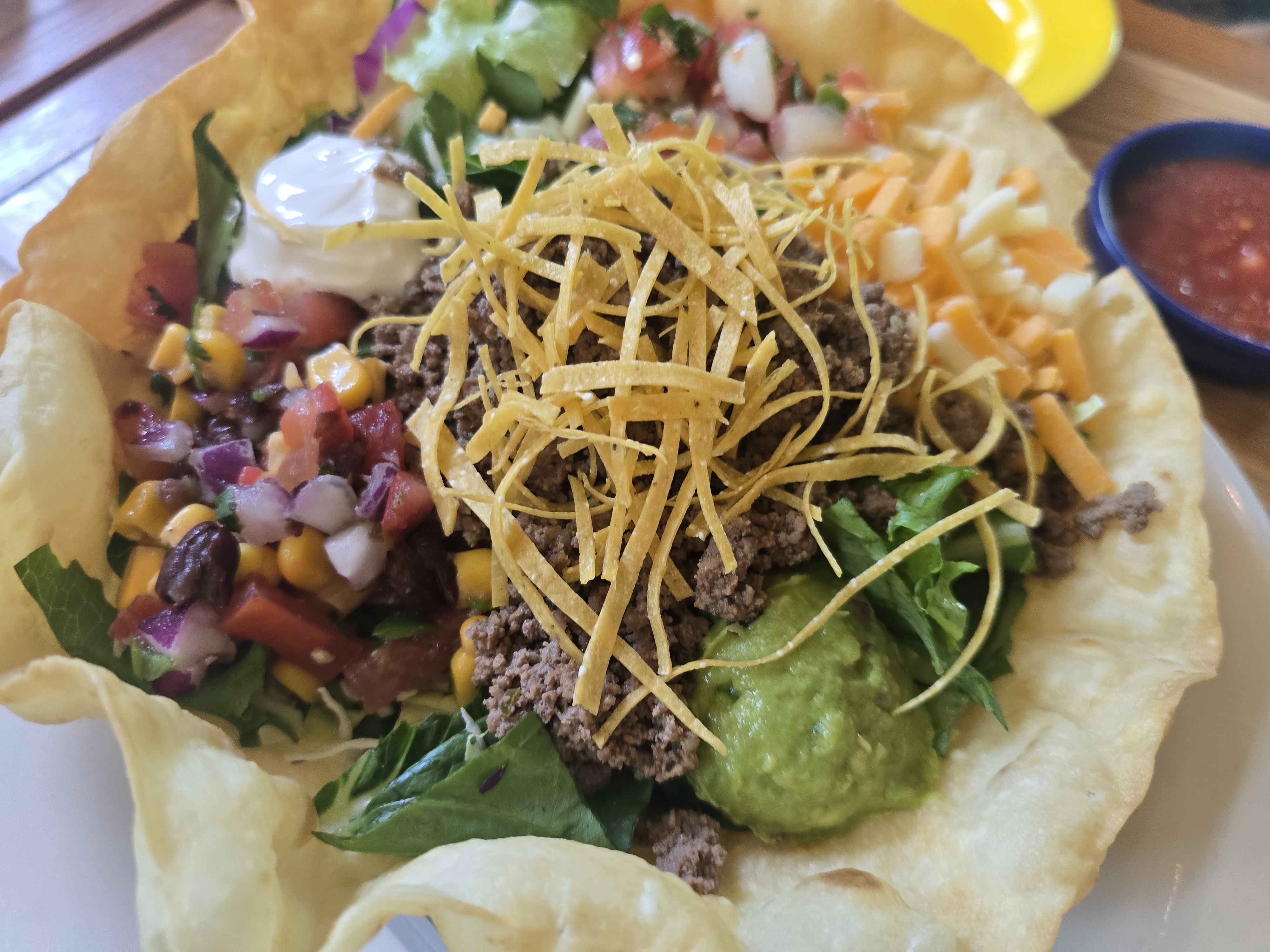 • 타코 샐러드: 접시 가득한 양상추, 토마토, 치즈, 그리고 고기 토핑까지 듬뿍 들어있어 푸짐했습니다. 상큼한 드레싱과 바삭한 토르티야 조각이 잘 어울렸고, 메인 메뉴 전 입맛을 돋우기에 충분했습니다.