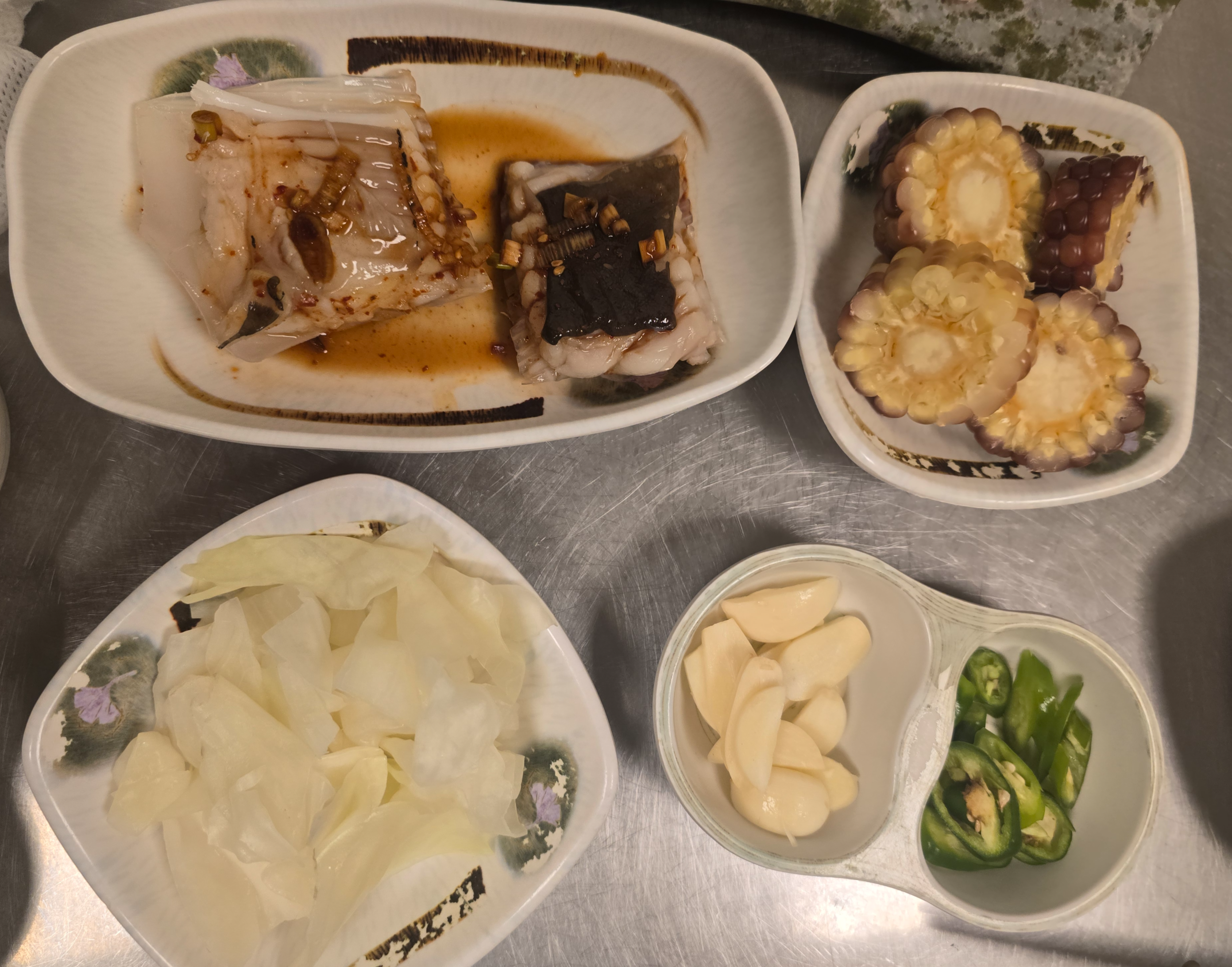얇게 썬 마늘과 청양고추, 달큰한 삶은 옥수수, 새콤한 무절임이 깔끔하게 담겨 나온다.