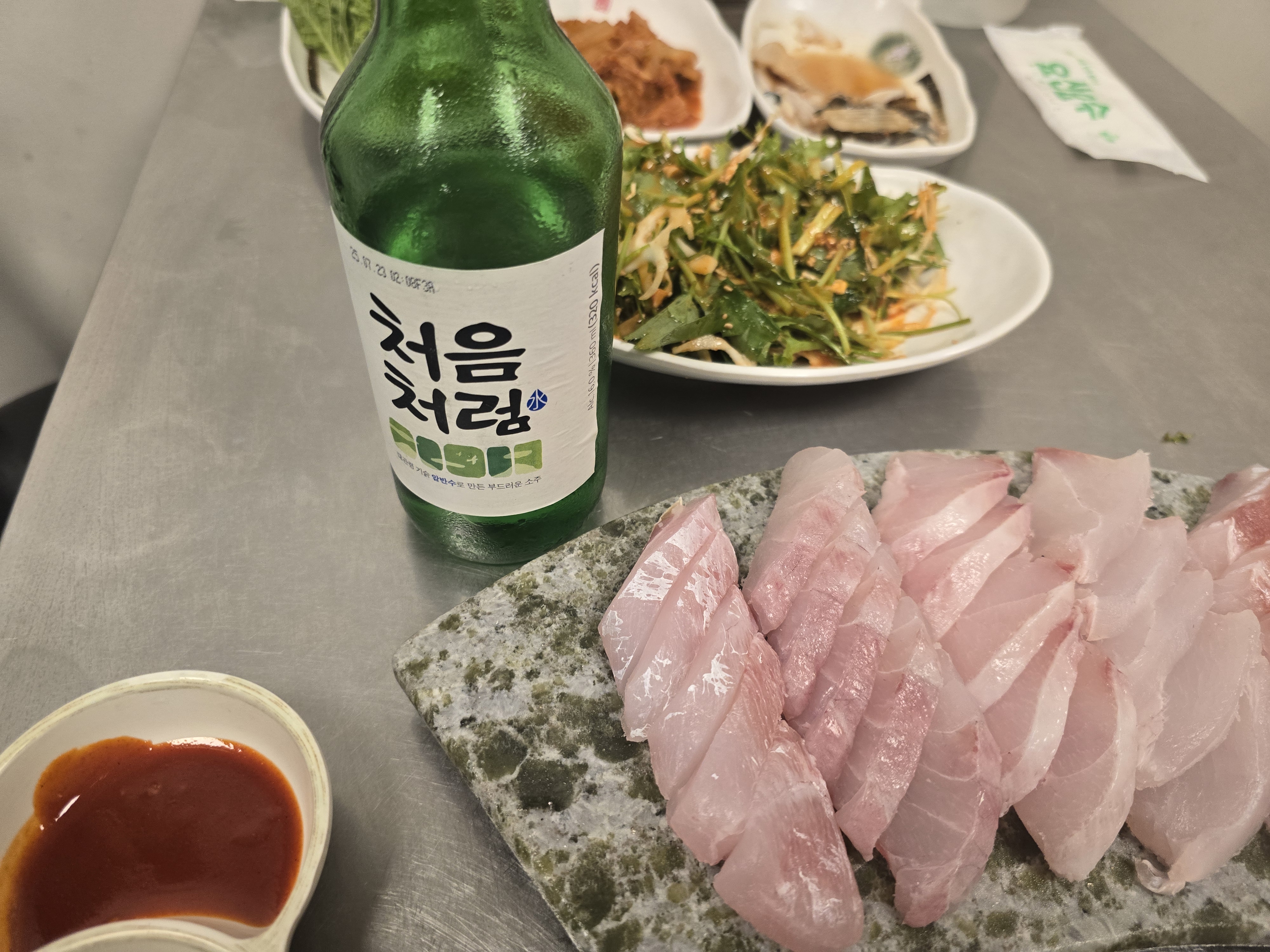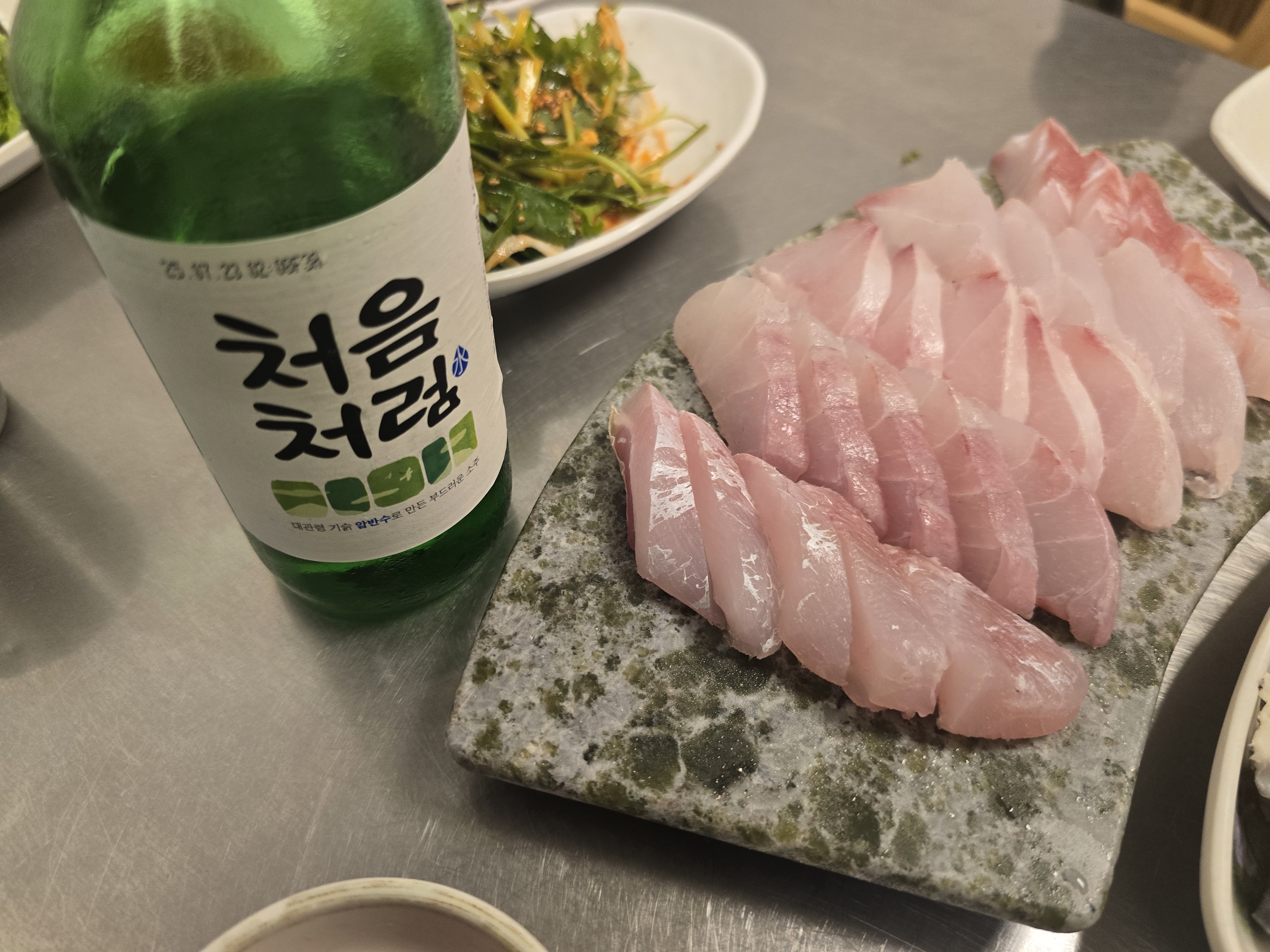 민어와 가장 잘 어울리는 술은 역시 소주다. 이날은 ‘처음처럼’을 곁들였는데, 민어 특유의 깔끔한 맛과 소주의 청량함이 잘 맞아떨어졌다. 회에 한 잔, 지리탕에 한 잔. 그렇게 술병이 어느새 비워져 있었다.