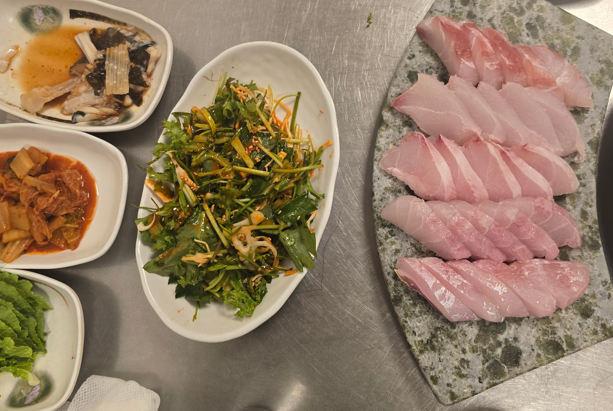 특히 이 파채무침은 매콤한 양념이 잘 배어 있어 기름기 있는 회와 잘 어울리고, 상추에 싸 먹으면 술안주로도 최고다.