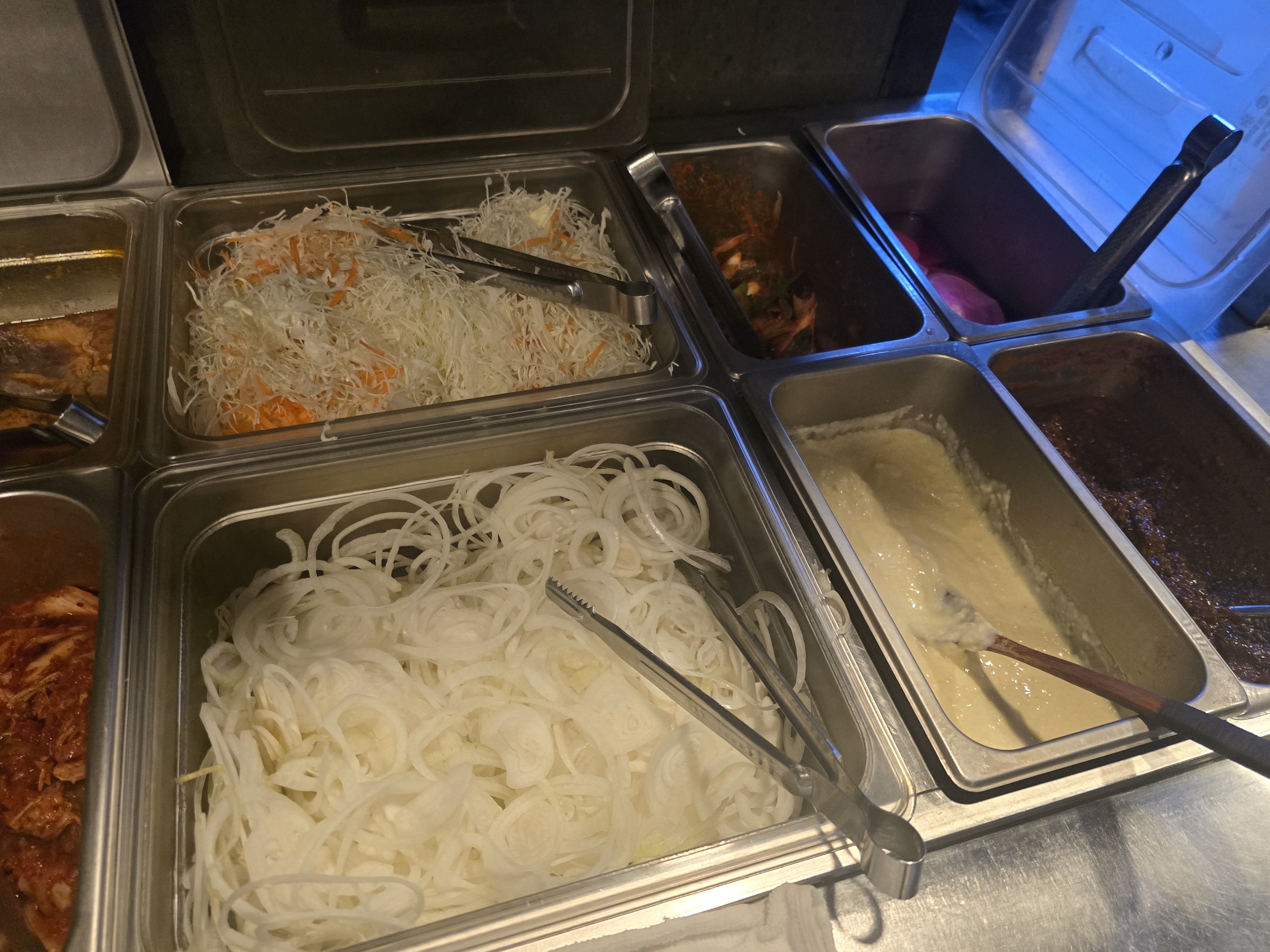 야채, 김치, 양파절임, 쌈장, 마늘—all free.