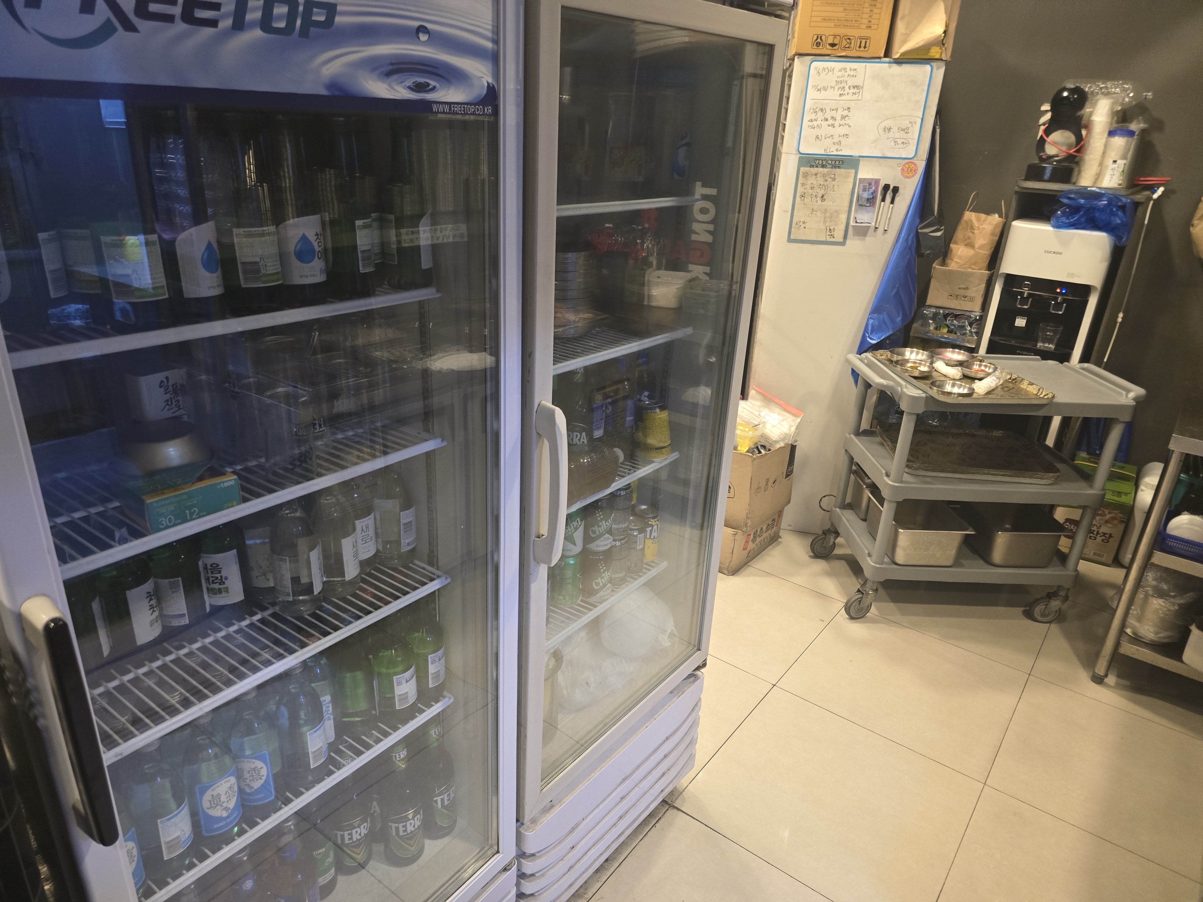 셀프바 근처엔 냉장고, 컵, 양념장, 그릇이 질서 있게 배치되어 있고,