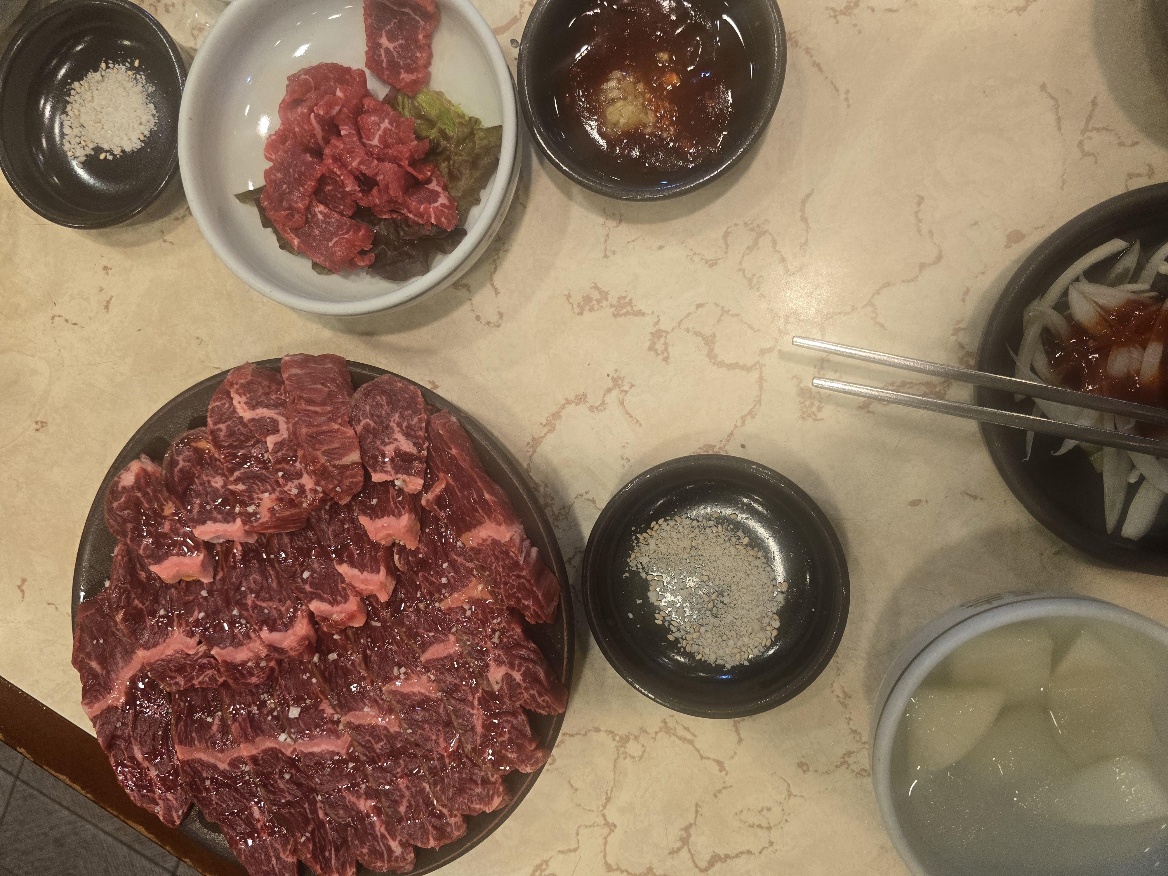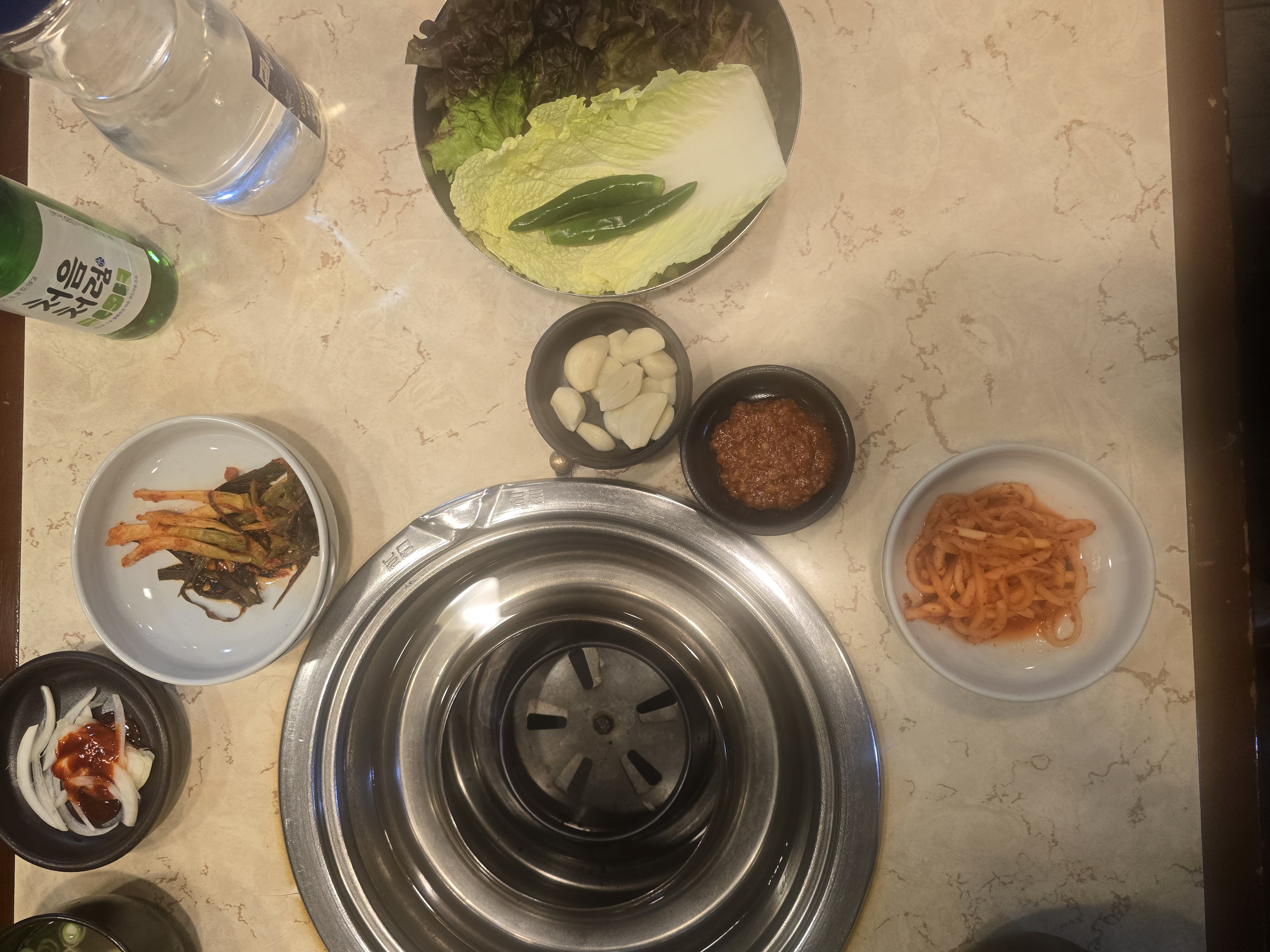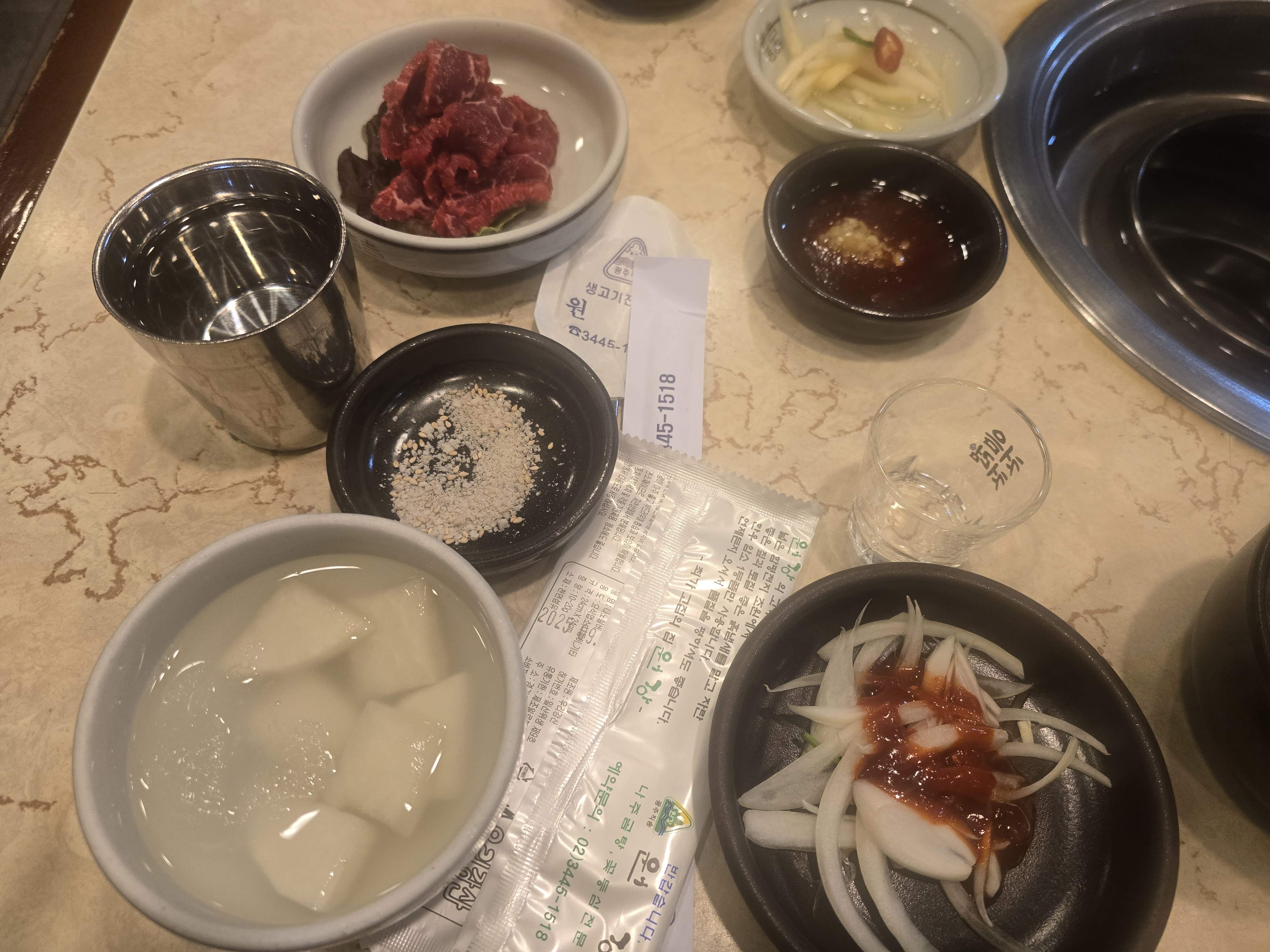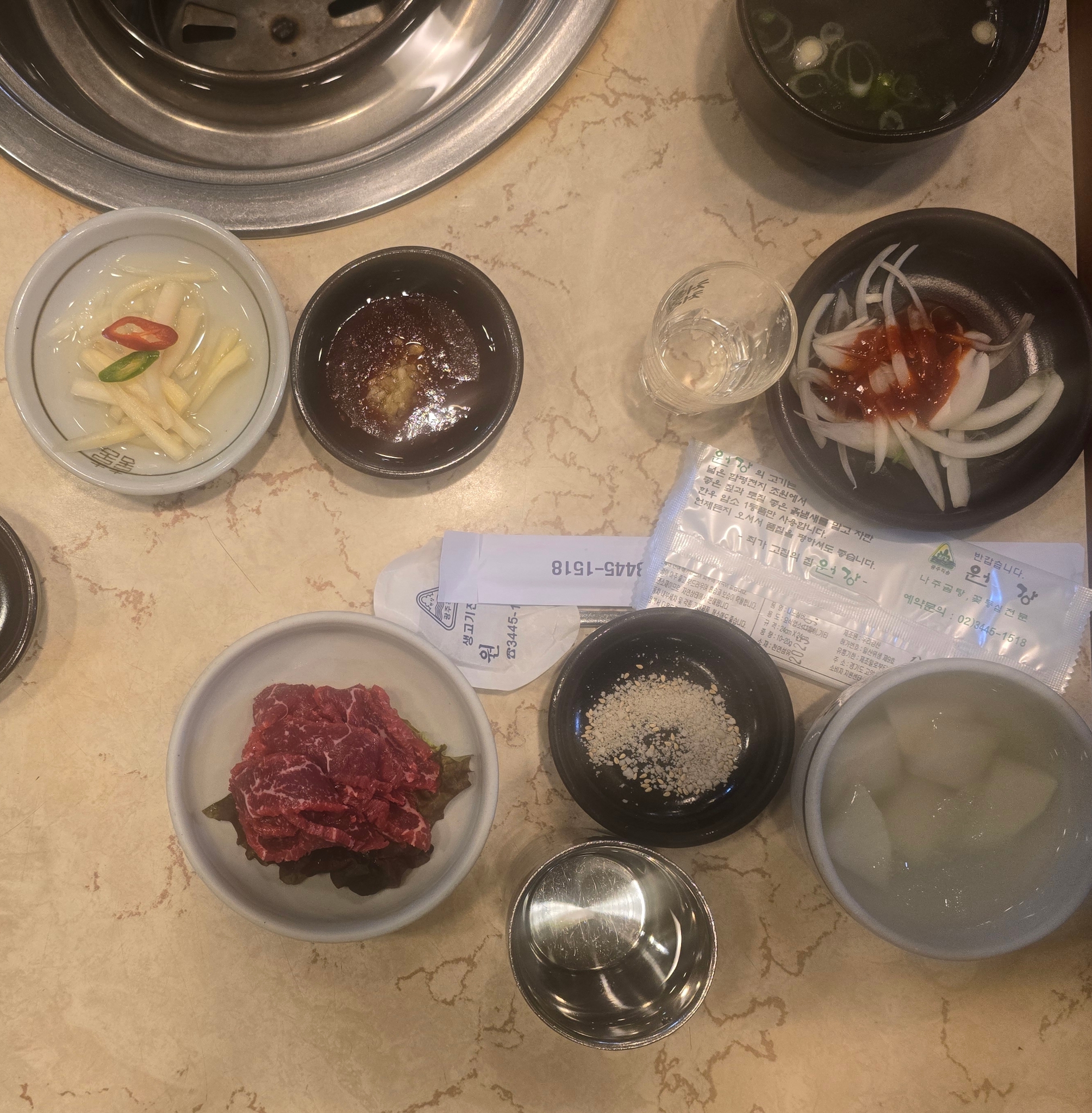 원강의 기본 세팅은 투박하지만 압도적이다. 동치미, 양파절임, 마늘장, 김치, 기름장, 소금…