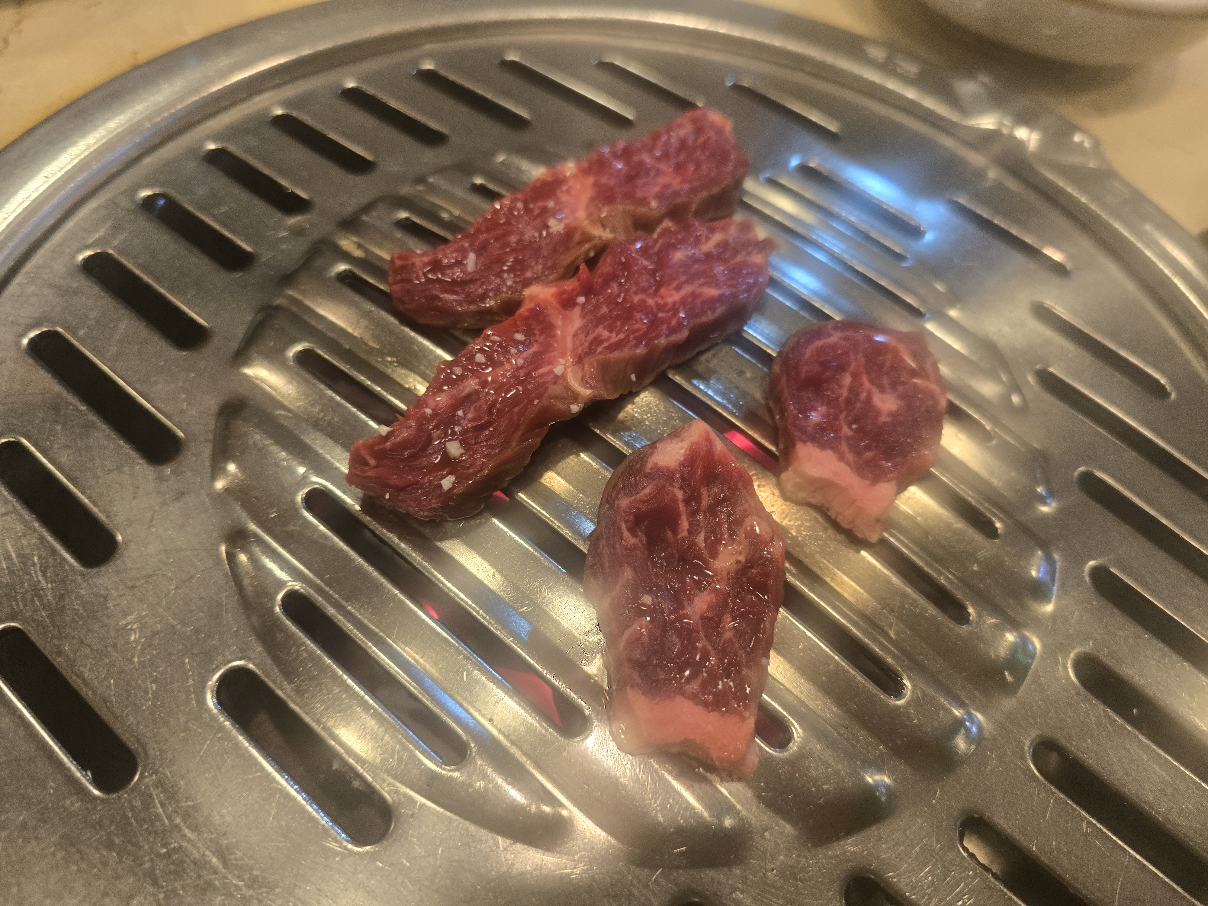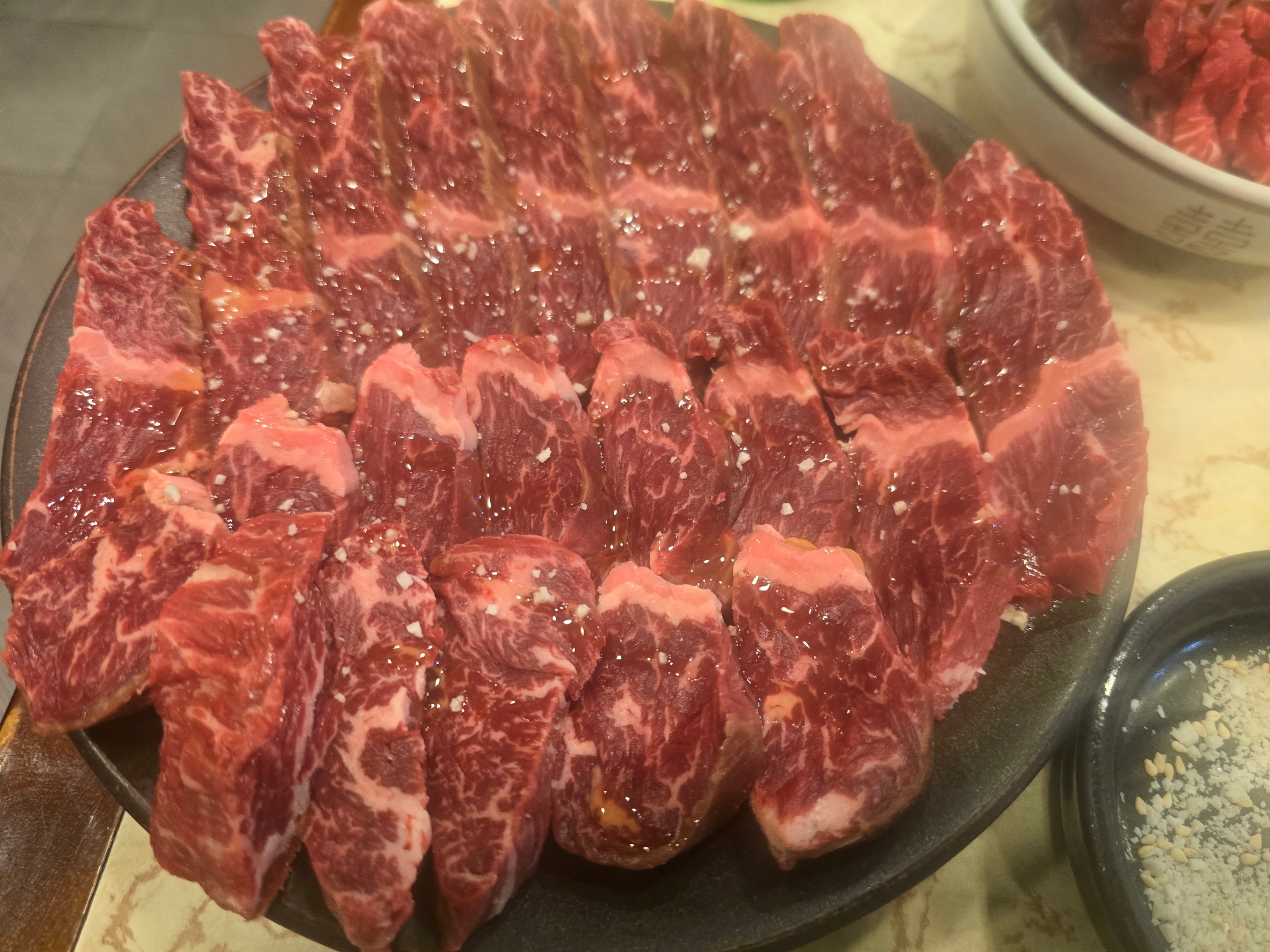 불판 위에 올린 순간 히트감이 다르다. 고소한 향이 퍼지고, 표면은 윤기가 돌며 육즙이 올라오기 시작한다. 적당한 마블링의 밸런스, 도톰한 두께, 촉촉한 육색. 사진을 안 찍고는 못 배긴다.