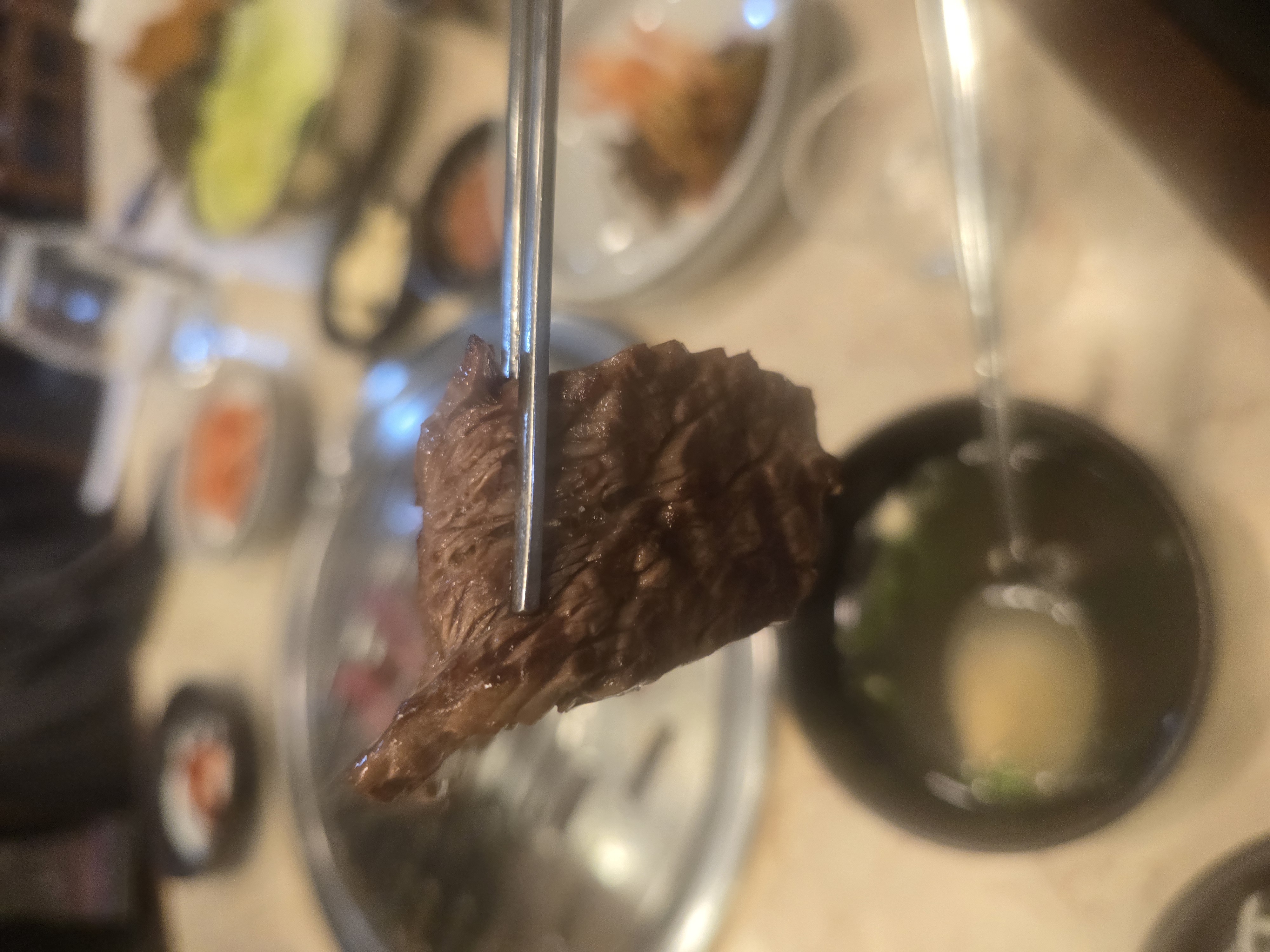 레어와 미디엄 사이에서 먹는 게 가장 원강다운 방식이다. 씹으면 육향이 먼저 치고 들어오고, 그다음 단맛이 올라온다. 지방의 고소함이 무겁지 않고 깔끔하게 떨어져서 계속 먹히는 맛. 소주와의 조합은 말할 것도 없다. 고기 한 점 – 소주 한 잔 – 다시 고기 한 점. 이 패턴이 끝없이 반복된다. 그래서 원강 오면 소주 두 병은 기본값, 세 병부터 본 게임이다.